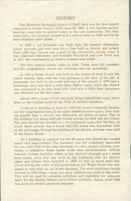 Methodist-Episcopal. George Washington ADAIR was one of the founders of the Methodist- Episcopal Church in Shell Rock, the first incorporated church in Butler Co, IA.